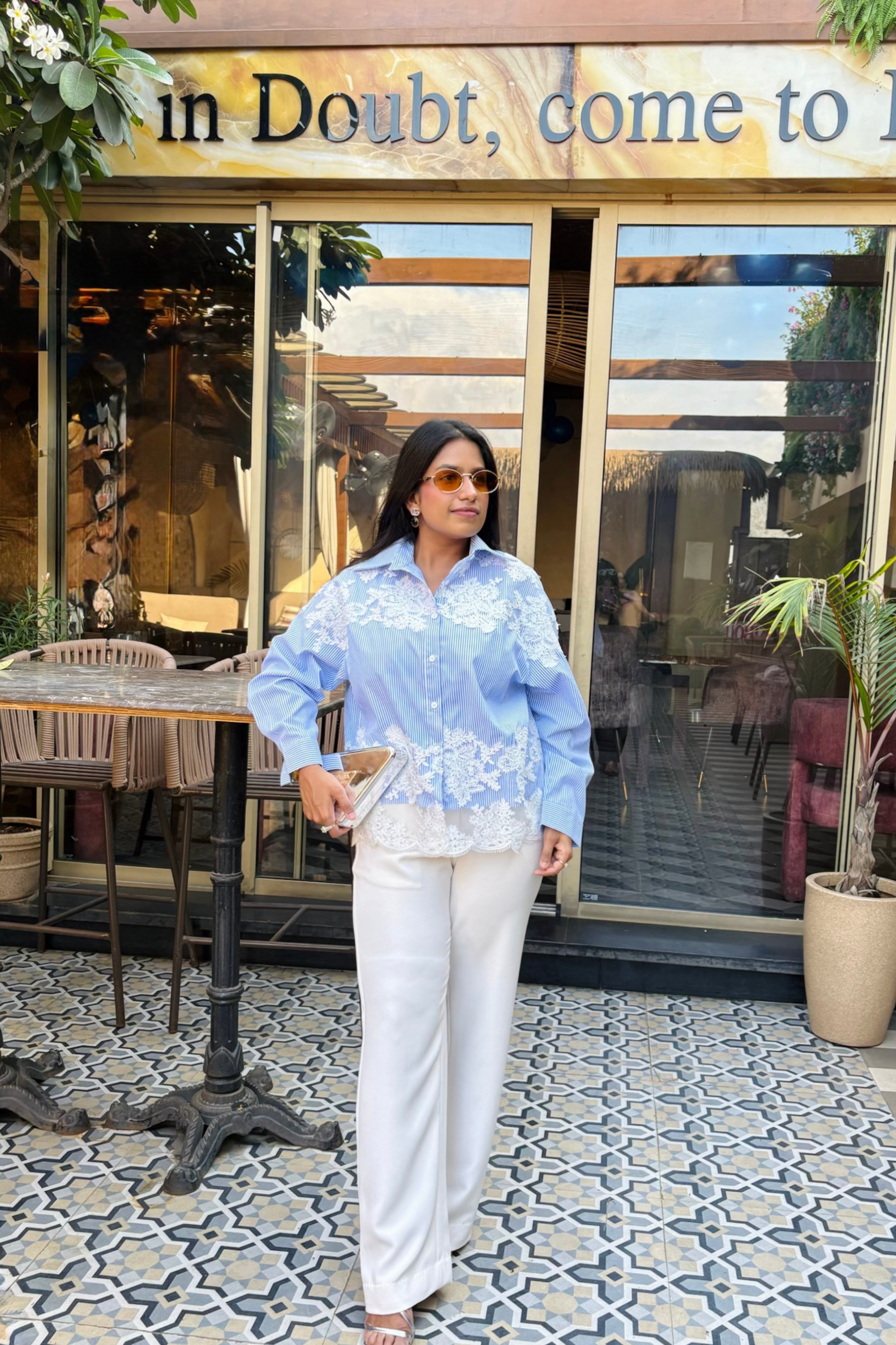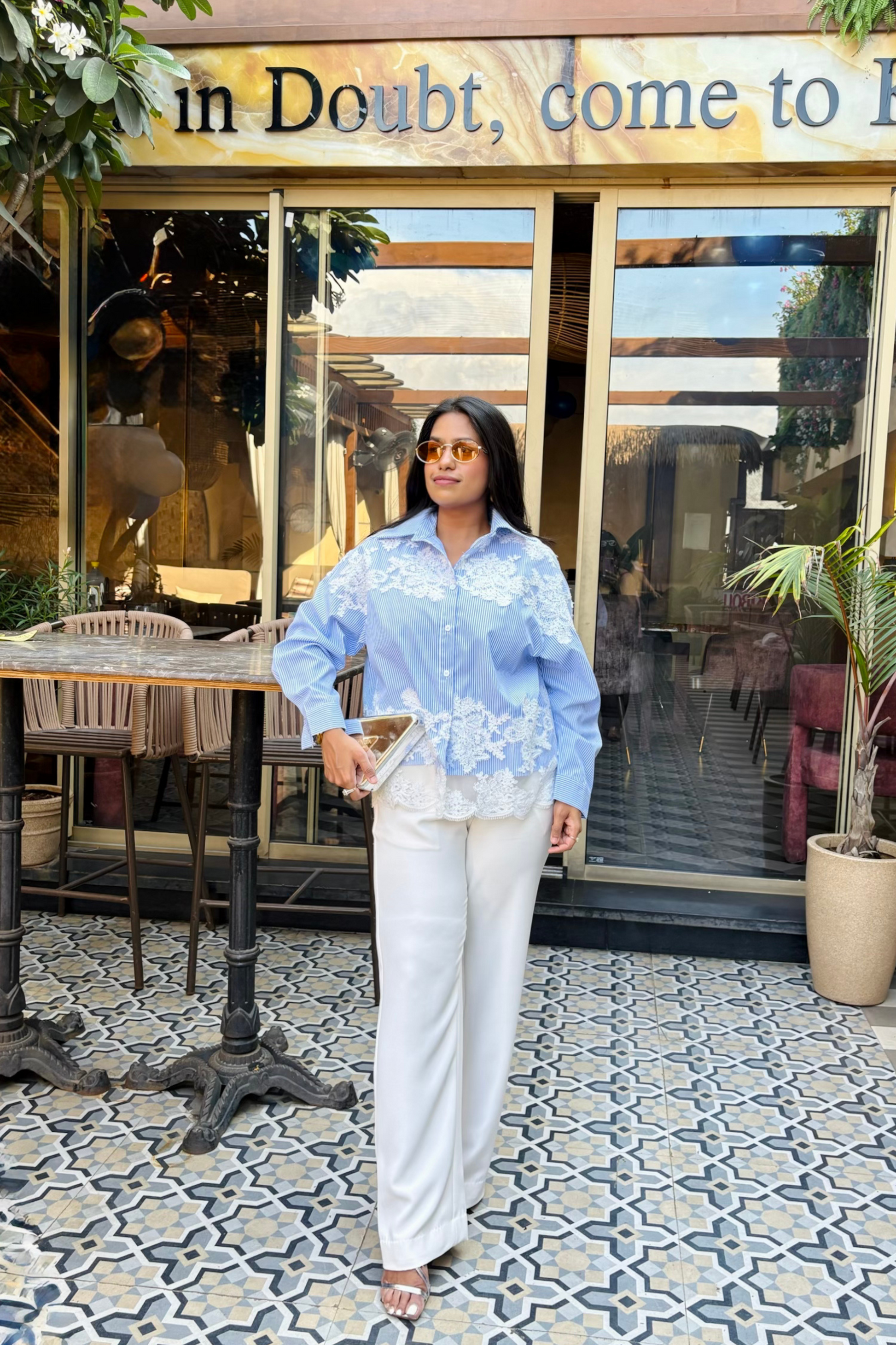 Full sleeves, front button down comfortable fit shirt with lace detailing at the bottom and sleeves. A shirt that would go a long way to style with any white pants this summer season!