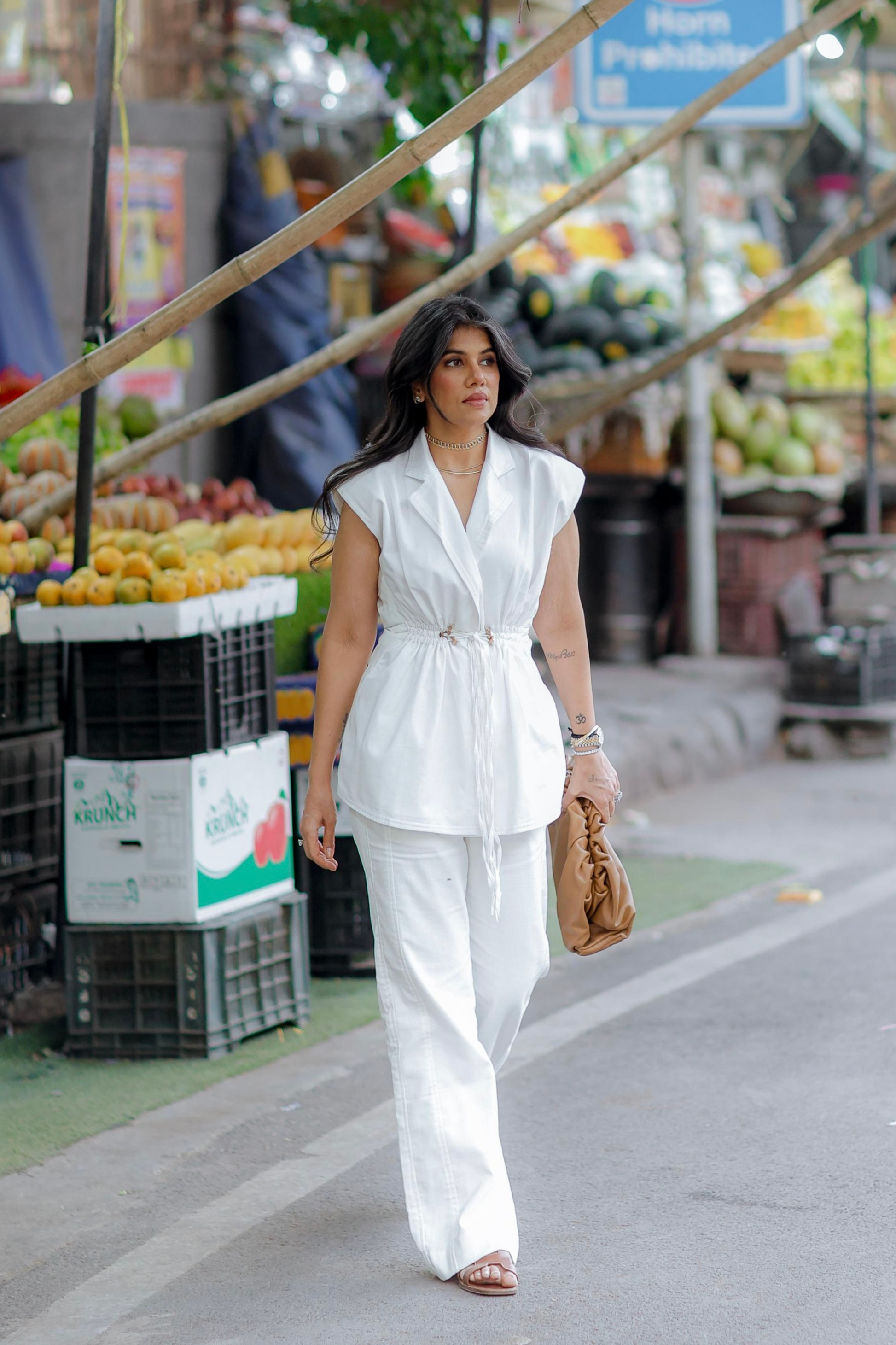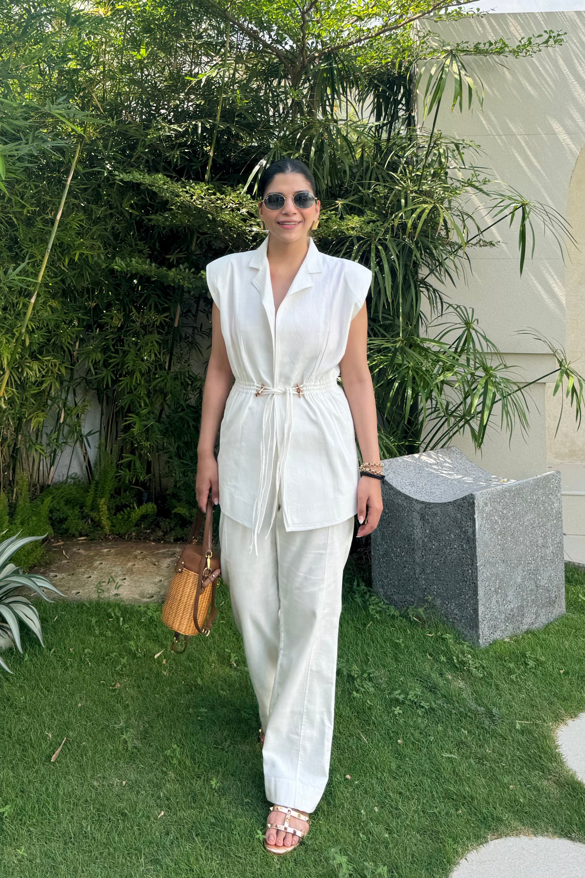Tailored elongated vest featuring a double collar, narrow lapel and drawstring tie-ups on both sides with metallic fasteners. Paired up with high waisted, relaxed fit pants with a back elastic and a drawstring detail along the waist belt.